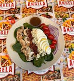 Spinach, Bacon, Mushrooms,Tomate,Onions, Gorgonzola Cheese crumbled,Hard Boiled Egg, Balsamic Vinegar.