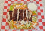 Romaine Lettuce, Shedded Carrots, Onions And Mozarella Cheese, House Bread Ckicken crispy It Comes with Ranch Dressing On side.